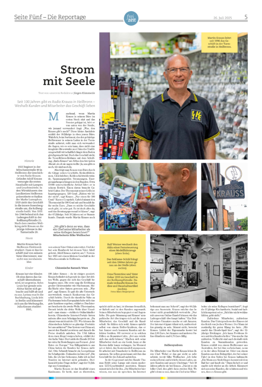Die Krauss Elektronik GmbH, von Adolf Krauss 1925 in Heilbronn unterm Namen Radio Krauss gegründet, ist bis heute dem Standort Heilbronn treu geblieben. Auch wenn der schwere Angriff der Alliierten um 1944 das Ladengeschäft in der Rosskampfstraße zerstörte, wanderte man nicht ab oder gab auf, sondern eröffnete schon 1945 erneut im Keller eines Hauses in der Halbmondstraße. Bereits damals war Radio Krauss über Heilbronn hinaus bekannt für die kompetente Beratung, den schnellen Service und die fachgerechte Reparatur von Radios. Bald wurde das Geschäft zu klein, so dass man 1950 in neue Geschäftsräume in die Turmstr. 20 umzog, wo man uns heute noch findet.